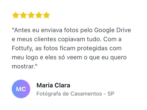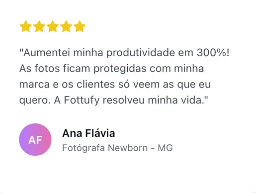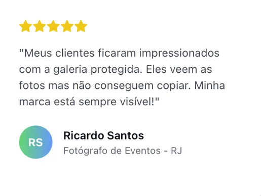 Suas fotos ficam protegidas com marca d’água personalizada. Os clientes podem visualizar e selecionar facilmente, mas não conseguem copiar ou salvar as imagens. Máxima proteção para seu trabalho!