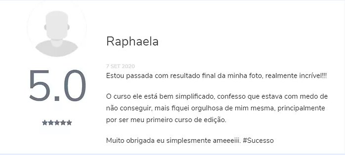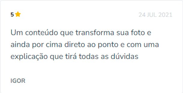 Com ele, você vai aprender a editar suas fotos com técnicas de edição avançadas, de forma descomplicada (colorização, ajuste de iluminação, de texturas, e muito mais). Tudo do zero até o avançado. IMPORTANTE: Você pagará pelo curso apenas UMA vez, não é mensalidade! Após a compra, o curso é seu!